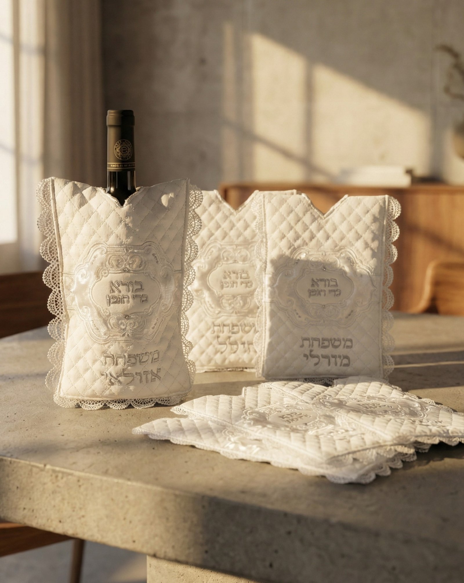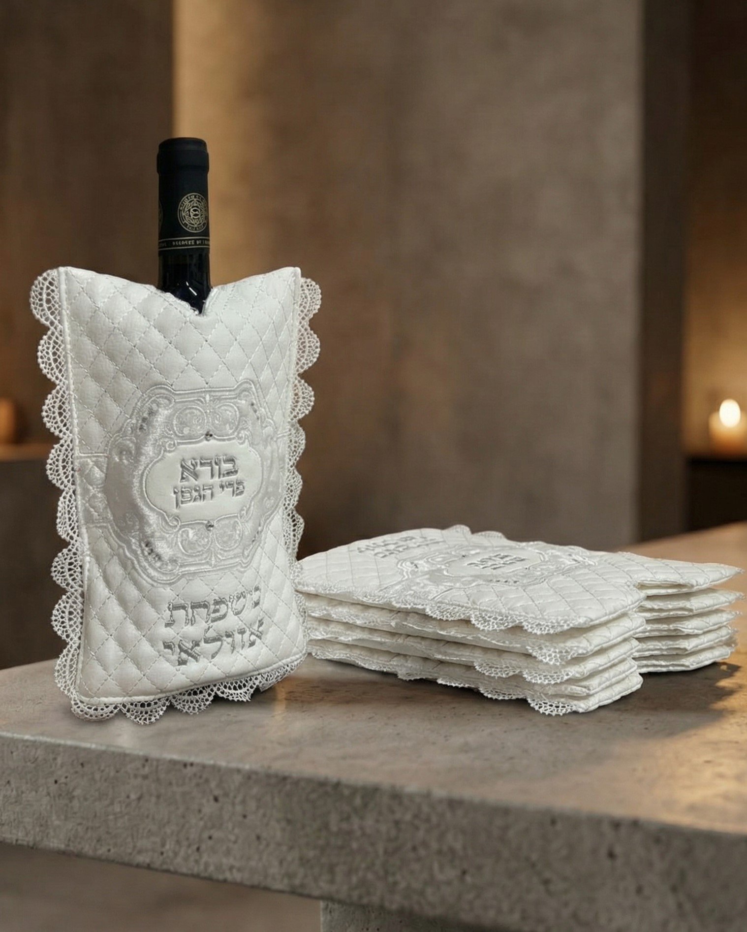 כיסוי מהודר ויוקרתי לבקבוק יין דמוי עור בתוספת שם המשפחה