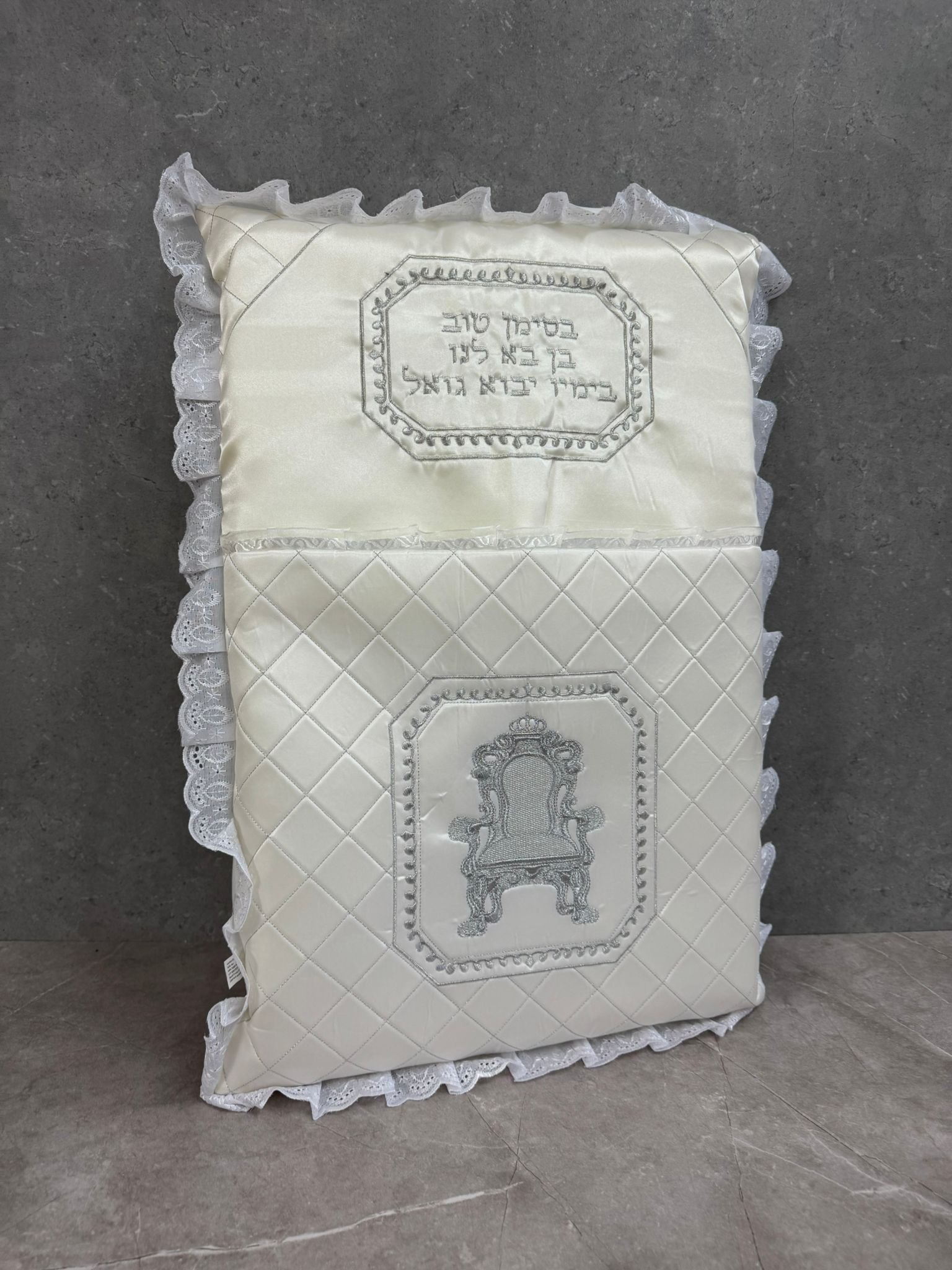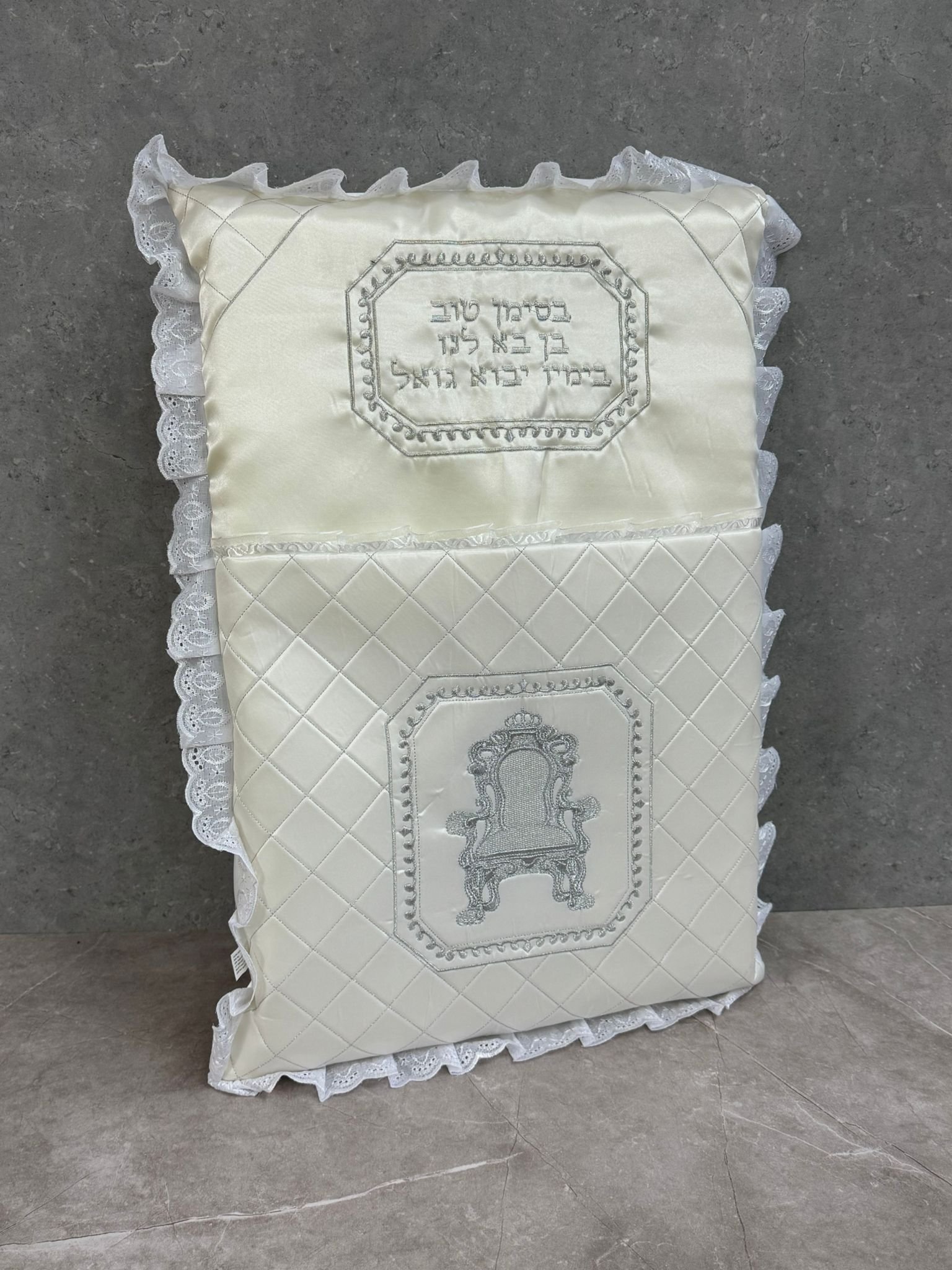 כרית מהודרת לברית עם רקמה כסופה ותחרה מידה – 74*50 ס"מ ניתן להוסיף רקמה אישית (לא חובה)